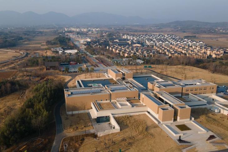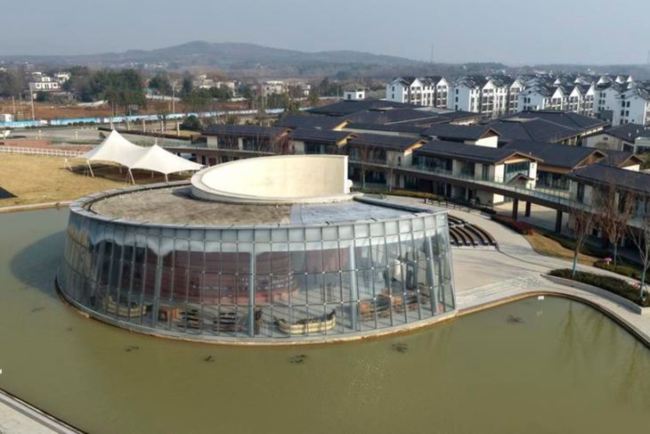 Foto dari udara yang diabadikan pada 25 Desember 2025 ini menunjukkan pemandangan pusat edukasi di situs peninggalan Lingjiatan di wilayah Hanshan, Kota Ma'anshan, Provinsi Anhui, China. (Xinhua/Huang Bohan)