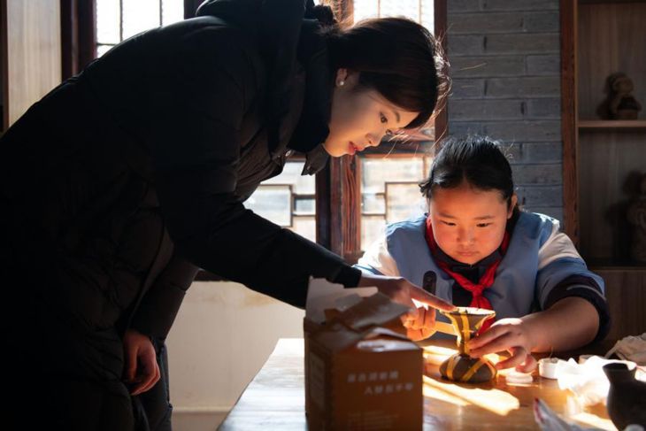Seorang petugas membimbing seorang pelajar untuk merakit replika tembikar di Taman Situs Arkeologi Nasional Lingjiatan di wilayah Hanshan, Kota Ma'anshan, Provinsi Anhui, China, pada 13 Januari 2026. (Xinhua/Zhang Duan)